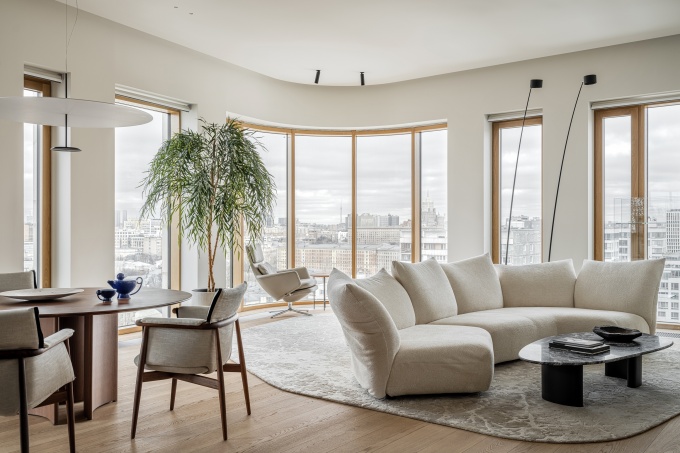 Квартира площадью 70 кв. м расположена в одном из корпусов клубного дома Artisan. Молодому человеку она понравилась своей локацией (тихие Арбатские переулки), размером и видом из окна спальни на шедевр конструктивизма. Именно памятник архитектуры 1920-х и вдохновил дизайнеров на проект: с чистой архитектурной формой, геометрическими объемами, тотальным белым цветом, контрастирующим со строгой и ритмичной отделкой дверей, оконных рам, бара. В итоге получился интерьер вне времени: эргономичный, с элементами сканди и ретро и эстетикой русского авангарда.