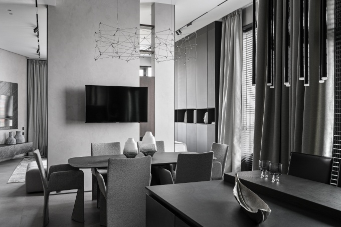 «Новую квартиру заказчик видел как комфортную «пещеру» с затемненным пространством, где приятно отдыхать после трудовых будней. Так как квартира достаточно глубокая, нам удалось гармонично соединить панорамное остекление и приватную атмосферу с нотой романтики», - отмечает дизайнер.