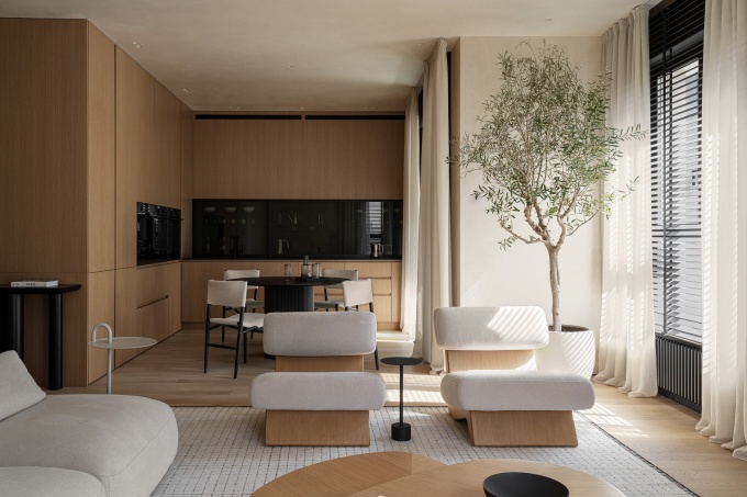 Эта теплая и очень тактильная квартира в стиле мягкого минимализма находится в новом районе Москвы, рядом с заповедной территорией.