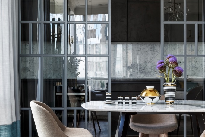 На создание этого элегантного, светлого, наполненного воздухом интерьера архитектора Дину Салахову вдохновила архитектура и окружение дома, в котором находится квартира. Жилой комплекс с малоэтажной застройкой расположен практически в лесу, его окружают высокие деревья, живая природа в черте города. Хорошие пропорции помещений, высокие потолки и роскошные панорамные окна, которые объединяют интерьер с пейзажем за окном, позволили создать городское жилье с атмосферой коттеджа на опушке леса.
