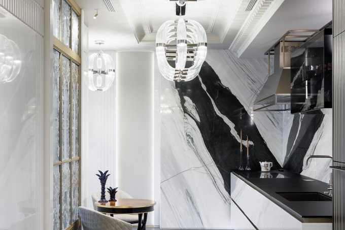 Особенность фасадов здания – исторические архитектурные приемы: арочные окна, крупный руст и «алмазная огранка» декоративных деталей. Именно они вдохновили автора на создание интерьера с необычной пластикой, деликатными рельефными орнаментами и элементами неоклассики.