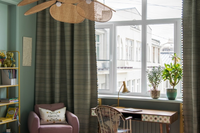Любая детская, как и домашний кинотеатр в частной квартире, предполагает применение разнородного освещения. Оно бывает представлено центральным светом в виде люстры, а также многочисленными точечными светильниками и локальными настольными лампами. Чтобы не препятствовать попаданию дневного света, окна принято декорировать полупрозрачными тканями, а также плотными шторами на время сна.