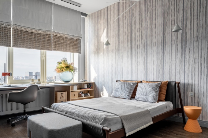Заказчик – топ-менеджер финтехкомпании, интересуется последними техническими достижениями, его супруга увлекается современным искусством, а сын-тинэйджер занимается киберспортом. Все вместе они хотели современную и «продвинутую» квартиру с качественными материалами, эффектными деталями, но без китча. На облик интерьера во многом повлияло расположение дома и панорамные виды из окон на приватный парк с одной стороны и на магистраль с перспективой высоток с другой. Сдержанная природная палитра и урбанистические акценты стали основой декоративного решения пространства.