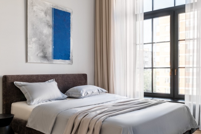 «Новую квартиру заказчик видел как комфортную «пещеру» с затемненным пространством, где приятно отдыхать после трудовых будней. Так как квартира достаточно глубокая, нам удалось гармонично соединить панорамное остекление и приватную атмосферу с нотой романтики», - отмечает дизайнер.