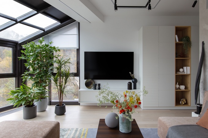 «С заказчиками мы обсудили только эргономику и планировочное решение. Предложенная планировка им очень понравилась, а визуализацию они утвердили с первого раза», - рассказывает автор проекта. Само пространство оказалось очень удачным и вдохновляющим. Квартира площадью 112 кв. м находится в новом доме «Олимпийская Деревня Новогорск» и имеет роскошное оранжерейное остекление в гостиной. Именно эту особенность дизайнер и предложила обыграть в проекте, сделать интерьер продолжением экстерьера, добавить пространству природной красоты.