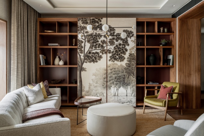 К дизайнеру Анне Павловской обращаются за артистичными и тактильными интерьерами, которые выглядят естественно и тесно связаны с природой: линии, формы, цвета, материалы – все в них живое и настоящее. Подбирая фактуры и размышляя об атмосфере квартиры для семьи с двумя детьми в ЖК «Вишневый сад», дизайнер представляла себе образ сада, где сквозь ветви деревьев проходит солнечный свет и оставляет причудливые тени на золотисто-охристой земле. Этот мотив залитого светом вишневого сада обрел воплощение не только в виде декоративного панно в гостиной, но определил колористику, текстуры и все наполнение интерьера.