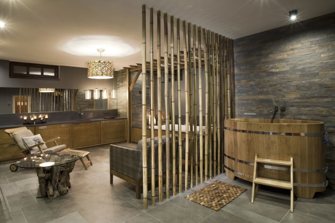 Определившись с основными требованиями по набору необходимых помещений в проекте бани, а точнее банного комплекса, архитектор приступает к поиску стилистического решения дизайна бани. Традиционным подходом к этому вопросу можно считать интерьер бани, в котором преобладают мотивы, определяющие стилистику самой постройки. Фасад строения, который может быть бревенчатым или бетонным, в зависимости от пожелания заказчика, диктует решение самого дизайна бани. Наличие русской бани и или финской сауны потребует, скорее всего, такого типа интерьера, в котором преобладает дерево, мебель в стиле кантри, а так же прочие элементы интерьера, отсылающие к этнической стилистике. Нетрадиционным подходом скорее станет тот, в котором учитываются предпочтения заказчика, связанные с самой эстетикой отдыха без привязки к типу парных.