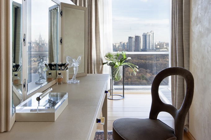 «Эти виды покорили семейную пару, они вдохновились атмосферой и предложили создать интерьер современный по наполнению, но тихий, спокойный, размеренный, с настроением старой Москвы», - рассказывает автор проекта Валерия Сенькина. Для реализации задуманного были выбраны материалы высочайшего качества и роскошные аксессуары.