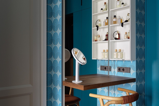 И хотя заказчики больше говорили о классическом стиле, изучая мебельные стенды, авторы проекта невольно «примеряли» новинки к проекту. Обтекаемые формы мебели, отделка из приглушенной латуни и сложный сине-зеленый тон пришлись по вкусу заказчикам и стали основой дизайнерского решения.