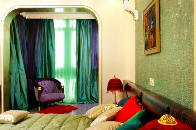 Уникальный дизайн будуаров в стиле гламур предполагает использование особых материалов: натуральной кожи, ценных пород дерева, дорогого текстиля и даже драгоценных камней. При оформлении интерьера стоит особое внимание уделить отделке пола, стен и потолка. Так, особую атмосферу создадут обои с бархатными узорами, потолок с глянцевым эффектом, «жидкий» пол, прочее. Цветовое решение будуара должно быть необычным и даже несколько вызывающим. Рекомендуется использовать яркие цвета, играть на контрастах, комбинировать оттенки.