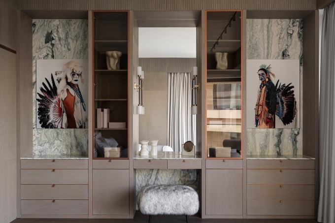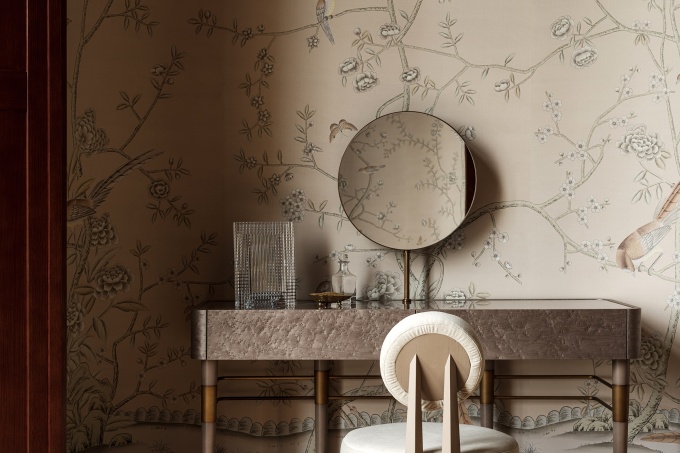 «Я не присутствовала на первой встрече, мне передали только запись разговора, - рассказывает архитектор. – В ней заказчица озвучила основные пожелания: связь интерьера с экстерьером, индивидуальная вневременная стилистка с отсылками к ар-деко, авторские, но без экстравагантности решения, нейтральная цветовая палитра с нюансной деталировкой и каменный пол в помещениях первого этажа. Сначала меня смущал камень, так как почти любой мрамор имеет активный рисунок и берет на себя много внимания. Но мне удалось найти идеальный вариант – юрский мрамор, у него абсолютно нейтральный цвет и сложная текстура с включением окаменелостей». В итоге именно камень задал основную линию: мягкие бежево-песочные оттенки и тактильные фактуры объединили весь интерьер. Благодаря такому решению все 1300 кв. м воспринимаются как единое цельное пространство, очень комфортное для проживания. Нейтральный цвет хорошо подчеркивает архитектуру и пластику стен и оттеняет цветовые акценты, раритетный винтаж и искусство.