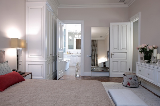 Квартира исполнена в уютном минимализме с элементами классического стиля. Идеей для создания интерьера послужило антикварное венецианское зеркало в ванной комнате. Его орнамент повторяется в плитке, фурнитуре мебели и форме хрустальных светильников Banci.