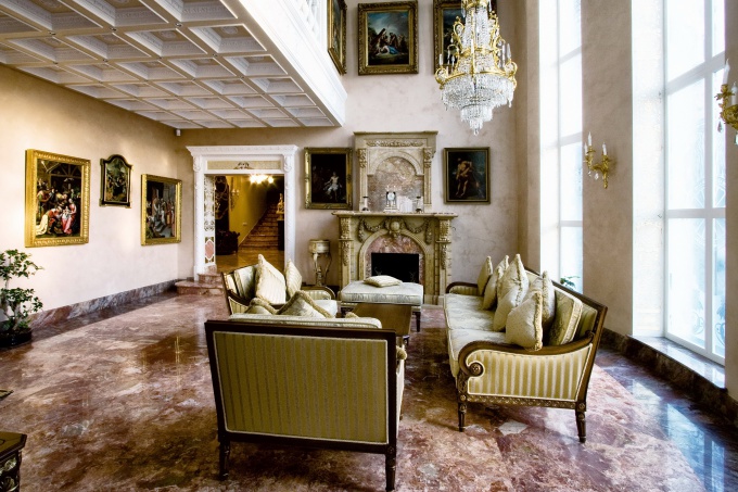 Интерьер VIP-отделения банка «ВТБ-24» на Гоголевском бульваре в Москве решен в стиле респектабельной классики, в дизайне представительских помещений зашифрованы отсылки к важным событиям из российской истории и знаковым персонам, с которыми ассоциируется мощь, сила и благосостояние государства.