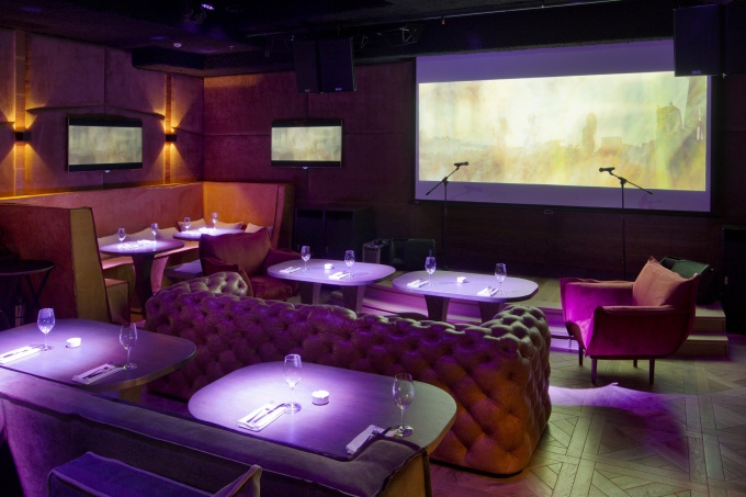 «Luciano караоке» находится на цокольном этаже трехэтажного ресторанного комплекса. Он рассчитан на 50 посадочных мест и оснащен профессиональной сценой. Перед автором проекта стояла задача создать камерное заведение с уютной атмосферой, не прибегая к привычному декору, с которым ассоциируется интерьер караоке.
