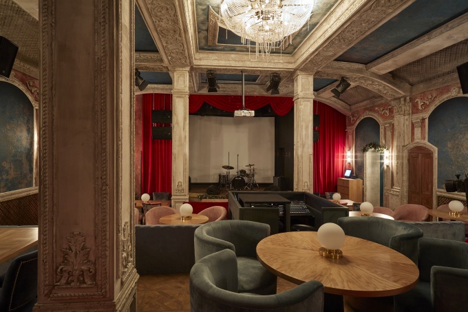 Идея интерьера – создать атмосферу заброшенного американского кинотеатра начала ХХ века, когда кино было событием, а кинотеатры напоминали театры: нарочито помпезные и эклектично роскошные. Сроки были очень сжатые для такого масштабного проекта, времени на подготовку практически не было, действовать следовало быстро и слаженно. Чтобы освоить столь существенный объем, необходимо было координировать рабочие процессы многих подрядчиков.
