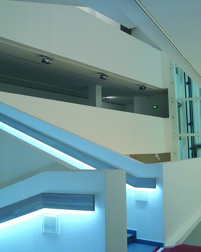 В качестве ядра всей композиции была выбрана вертикаль - световой атриум, который объединил вокруг себя разворачивающееся пространство. Первый уровень строения включил в себя входную группу и административные помещения. Один из нижних уровней отдан гардеробу, санузлам и залу для проведения конференций. На другом - расположились инженерно-технические помещения и автостоянка.