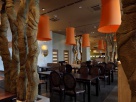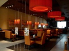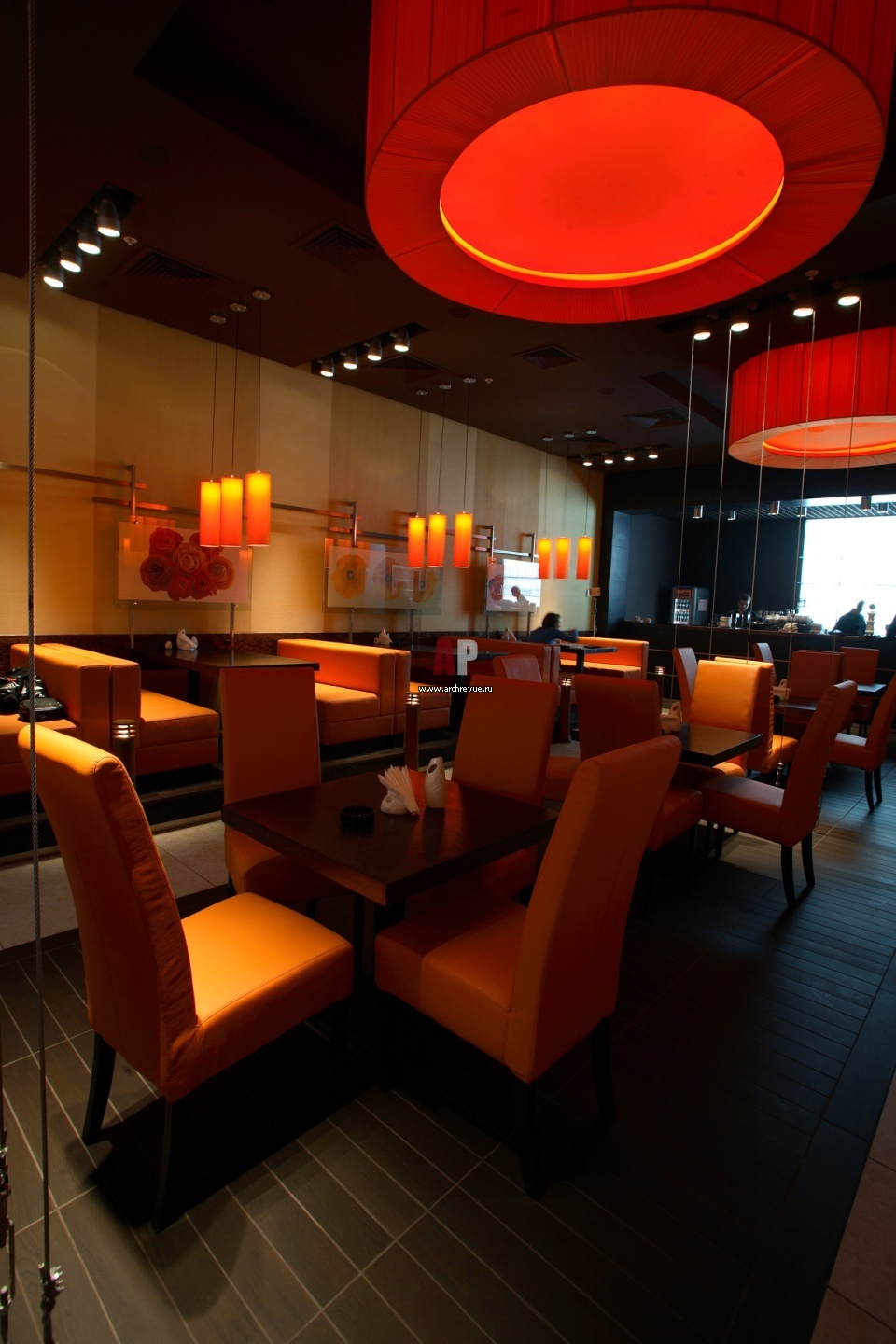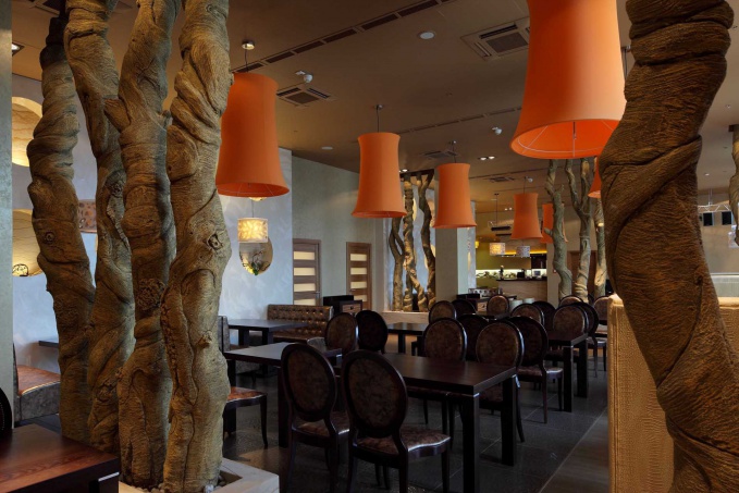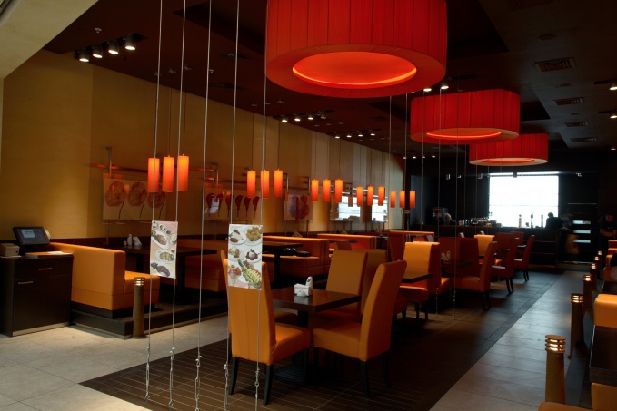 Абажуры прекрасно декорируют любые интерьеры ресторанов, не зависимо от их площади. Мы оформляли буквально крошечный 50-ти метровый ресторан в торговом центре, максимально открытый, весь в стекле. Его надо было оформить ярко и привлекательно.