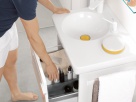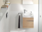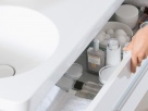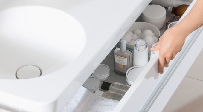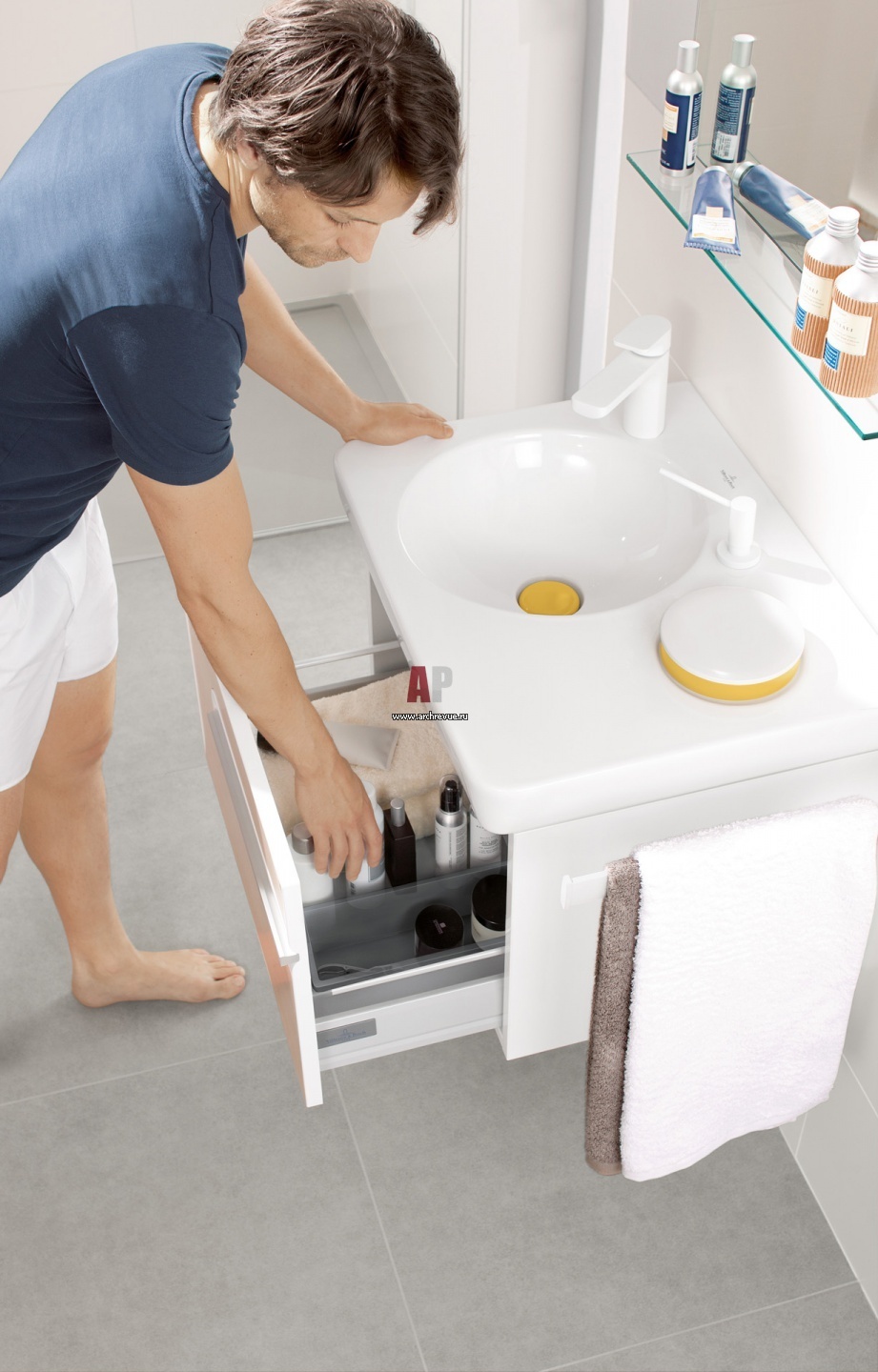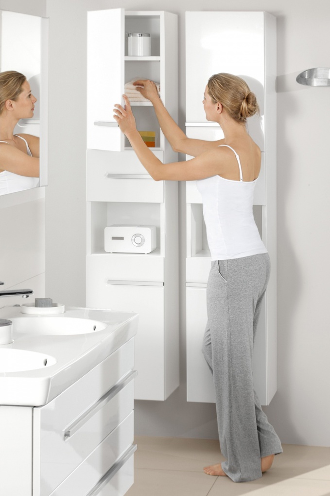 Мебель для ванной комнаты Joyce от Villeroy & Boch включает в себя многофункциональный вместительный шкаф, два шкафа-пенала, боковой шкафчик и тумбы под раковину различных размеров.
