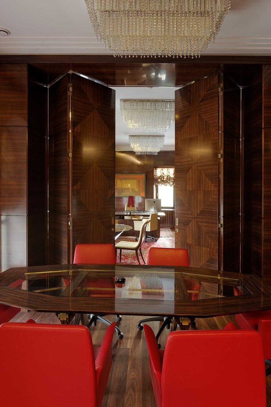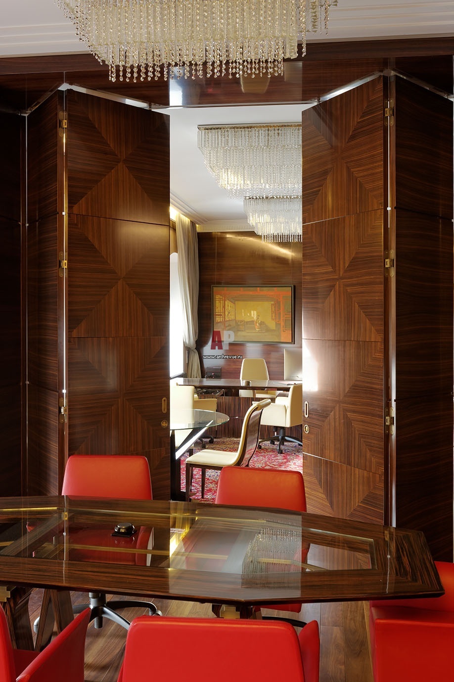 В одном из vip офисов мы придумали и реализовали сложные, более 3-х метров в высоту, складывающиеся двери-трансформеры, позволяющие при необходимости превращать рабочий кабинет в большое переговорное пространство.