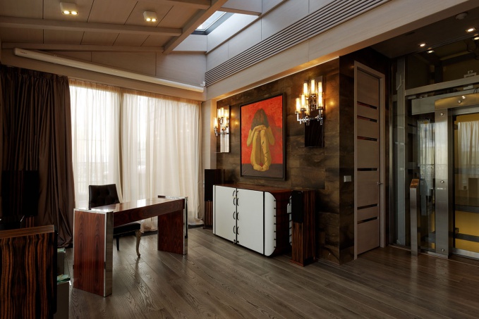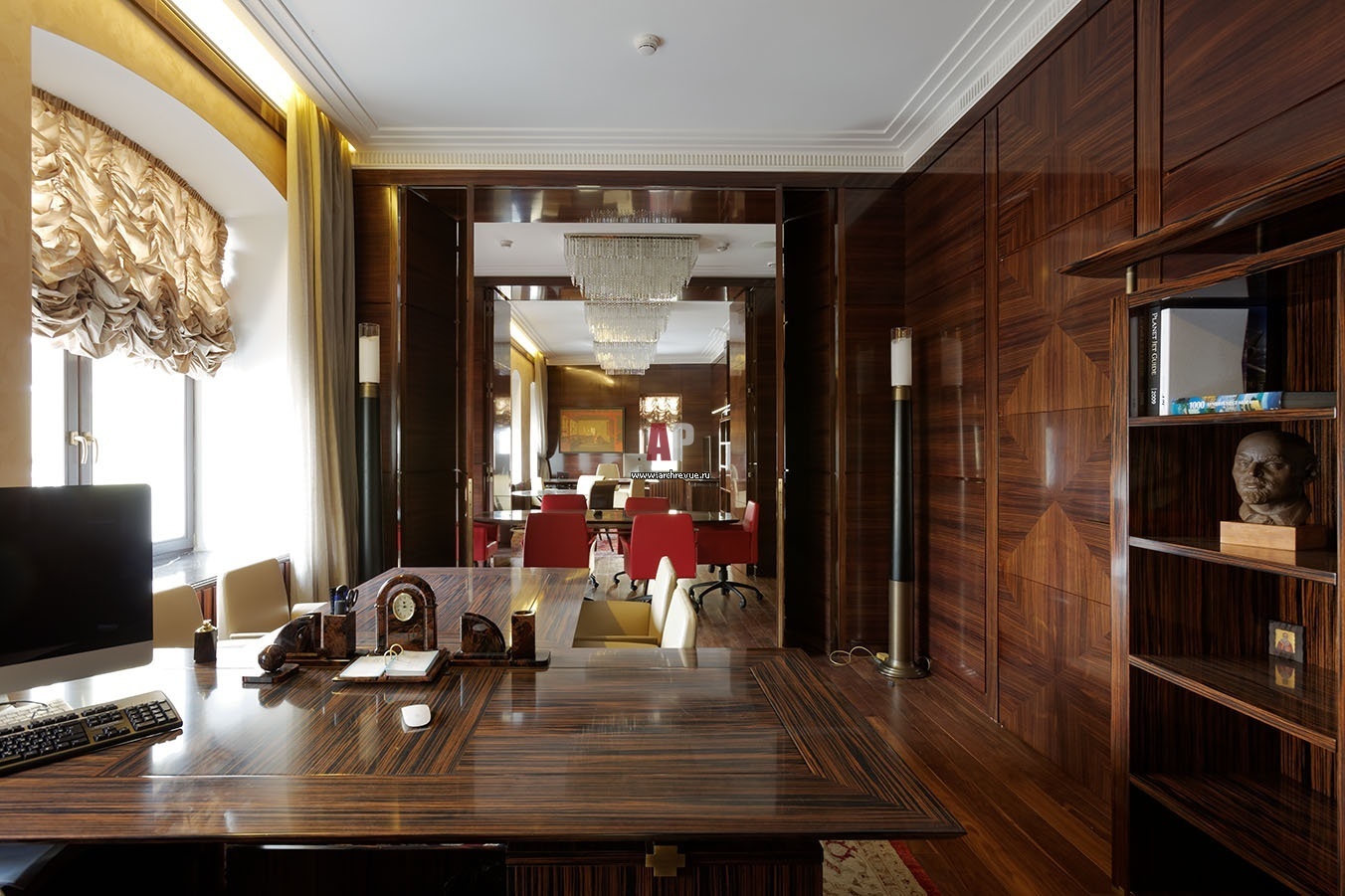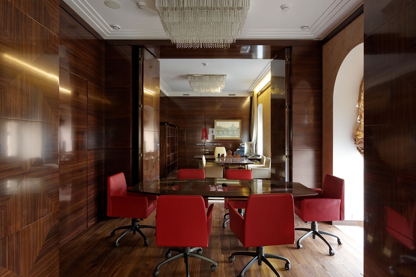 Сложными являются и интерьерные решения, всегда индивидуальные, связанные не только с эстетикой. Интересные отделки, художественные решения, дорогие отделочные материалы бывают продиктованы, например, необходимостью совмещения в пространстве личного кабинета условий для уединенной и командной работы.