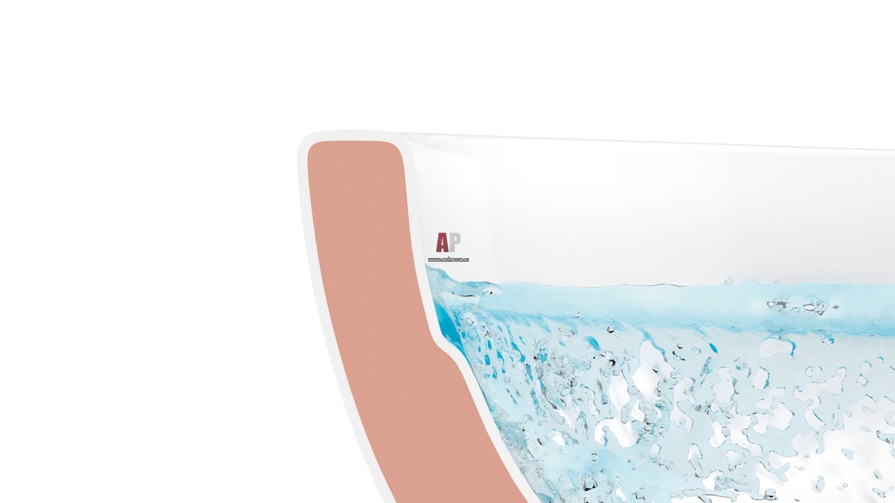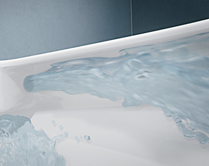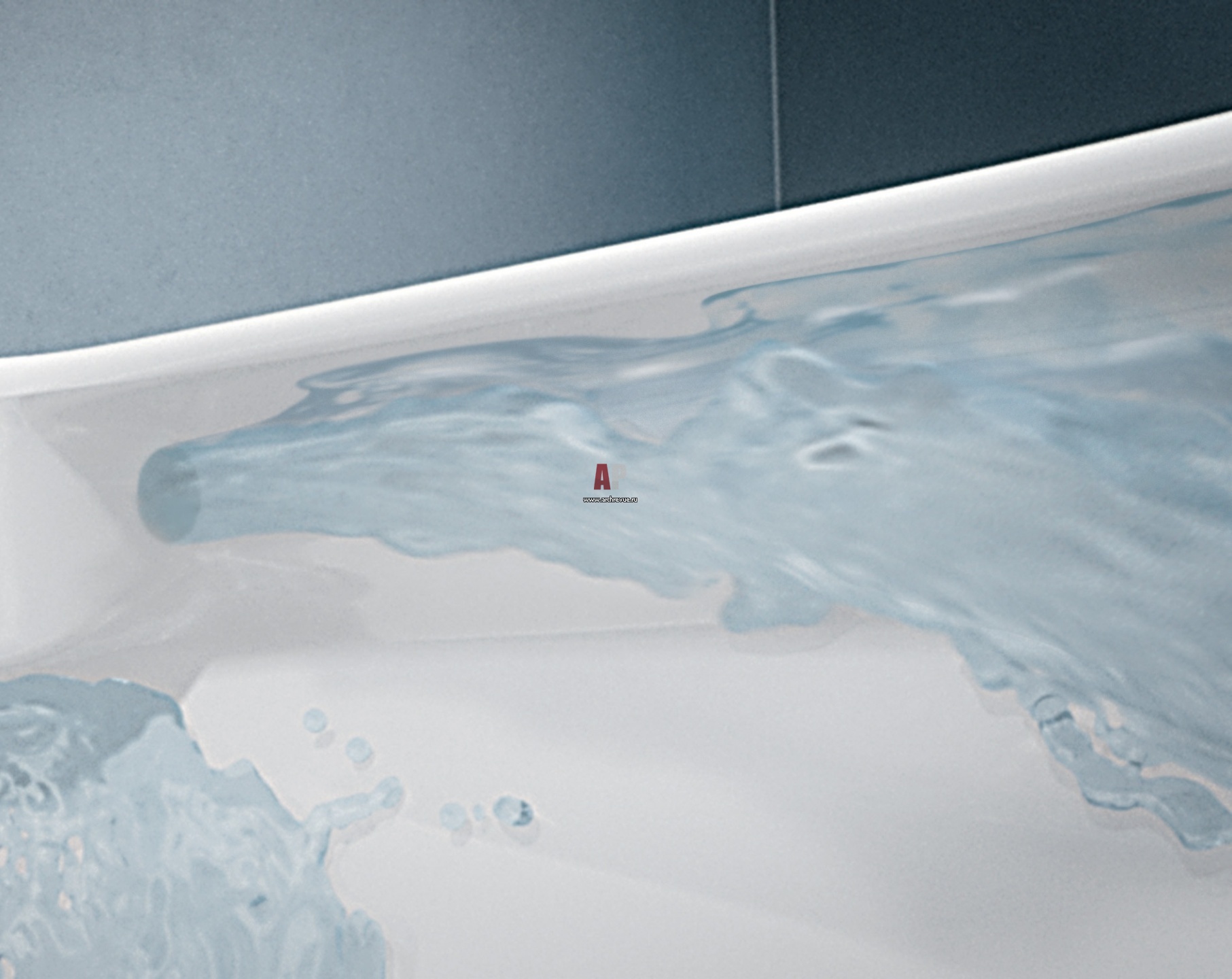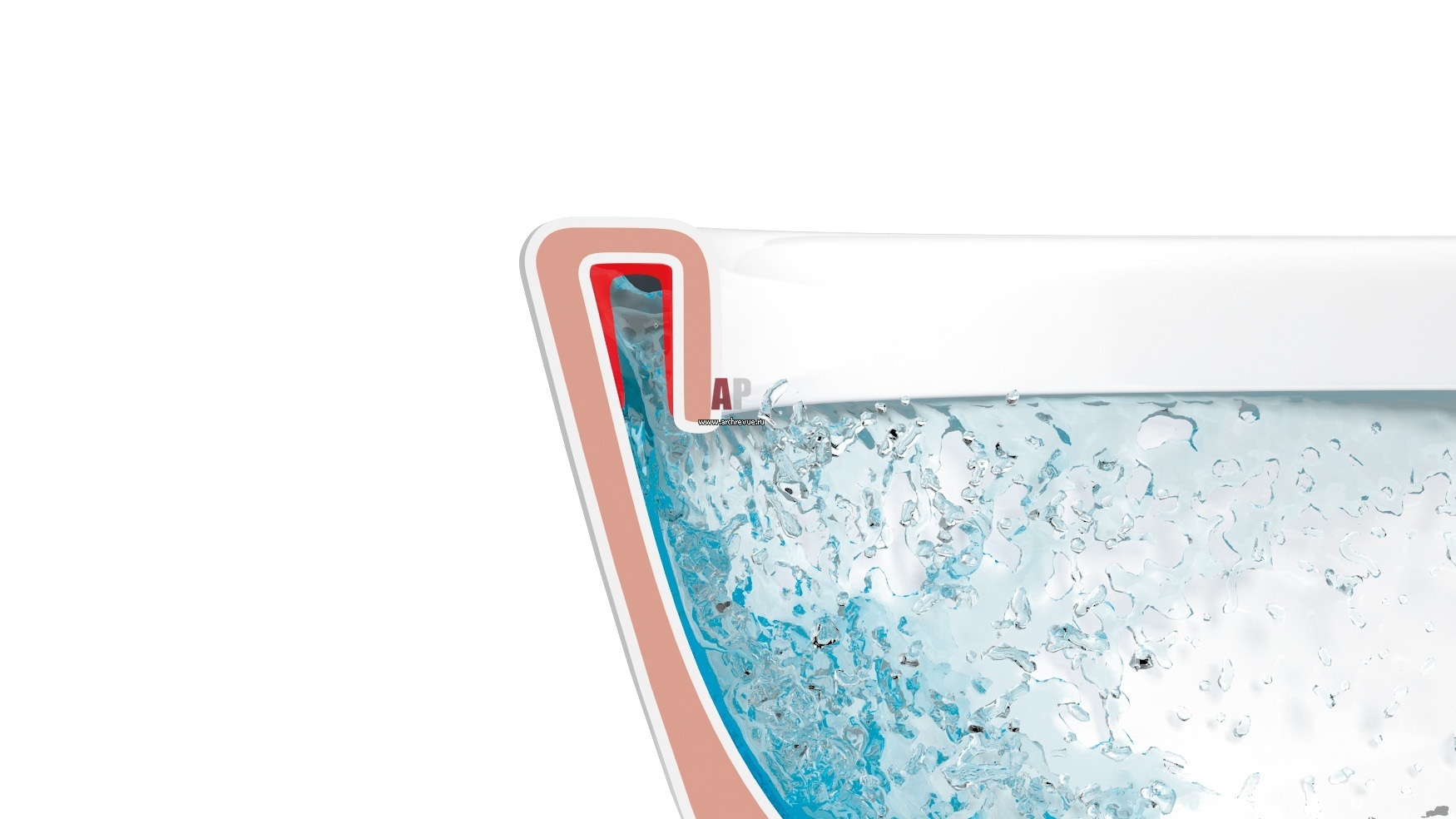 Это достигается за счет специальной защиты от брызг на верхнем крае чаши и высоко расположенными водяными форсунками.