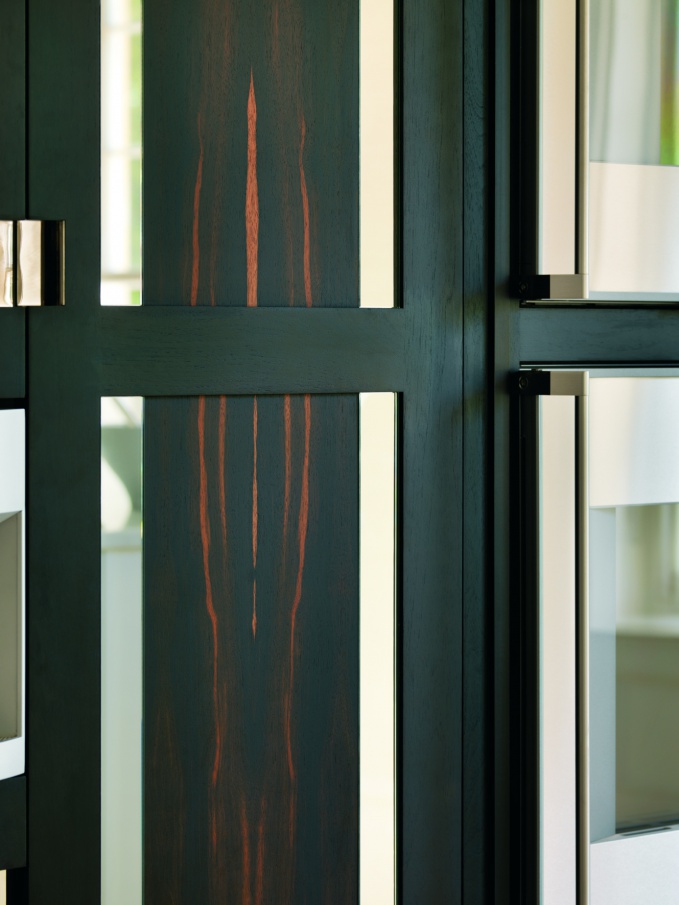 Кухня Macassar – это контрастное сочетание светлых фасадов, темных благородных отделок из древесины макасар и зеркальные вставки, многократно их отражающие.