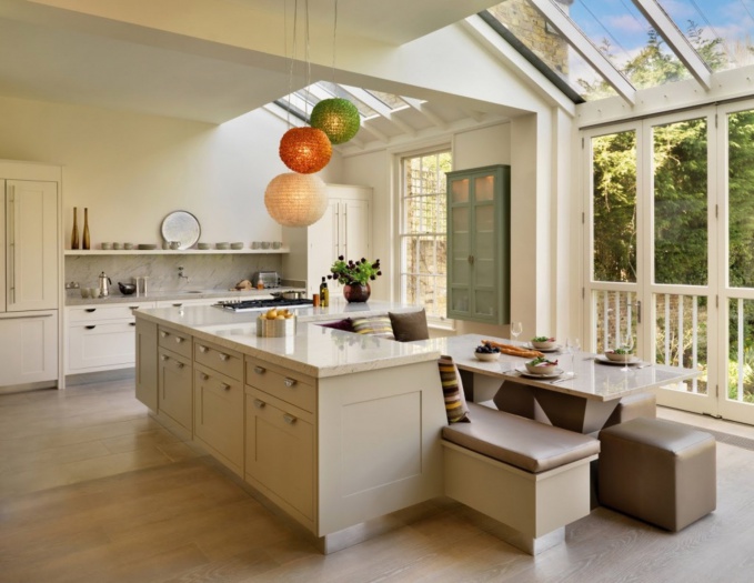 Эта коренным образом изменившаяся идеология в подходе к кухонной зоне позволила в дальнейшем не просто рассматривать кухню как место сопряжения функции и эстетики, но и включать ее в общее интерьерное решение, объединяя кухню с гостиной…