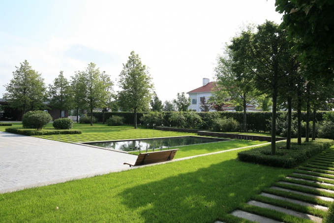 Прямоугольный формальный пруд. Ландшафтный дизайн IL NATURE. Подробнее об объекте см здесь.