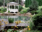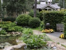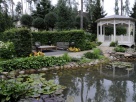 Элементы соответствия. Прогулочные дорожки, скамейки, берег водоема, мостики относятся к элементам соответствия. Их оформление очень важно для создания гармоничной композиции в ландшафте с садовыми прудами. В отделке всех этих зон и элементов используются натуральные материалы, дополняющие естественную красоту садового пруда: камень, гравий, галька в сочетании с деревом. Все они должны сочетаться с высаживаемыми в зоне пруда растениями. Важно, чтобы все растения были не очень пестрые и пышные, но крупнолистные.
