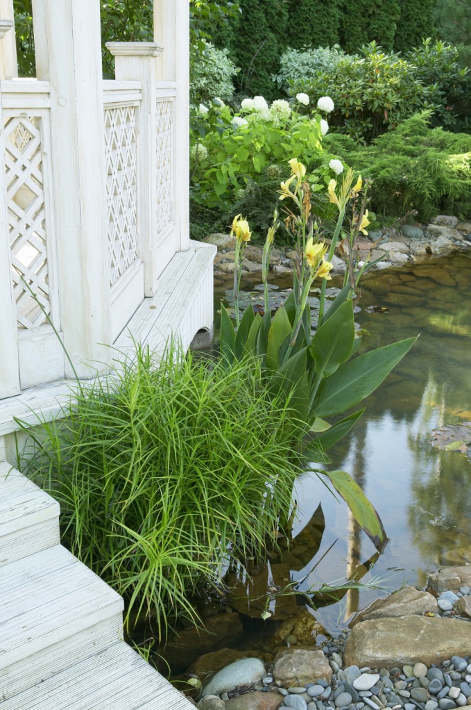 Растительность: околоводные и водные растения. Садовый пруд нуждается в натуральной растительности. Растения должны соответствовать размерам пруда, вписываться в общую композицию сада, быть влаголюбивыми. Растительность этой зоны следует разделять на две группы - околоводную и водную.