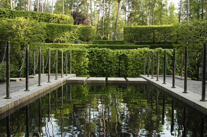 Формальный пруд – классика ландшафтного дизайна, один из самых эффектных приемов оформления садов и парков, все чаще становится центральным элементом ландшафта, созданного на участке с современной, модернистской архитектурой. Особенно важно в случае, если такой пруд располагается неподалеку от здания, соблюсти выверенное соотношение такого формального пруда с площадью не только участка, но и постройки.