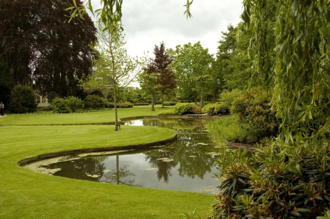 Размещение воды впритык к газону. Это великолепное решение позволяет визуально расширить пространство, сделать воду полноправным участником ландшафта. Декоративный пруд оказывается на лужайке перед домом, становится визуальной доминантой на участке.