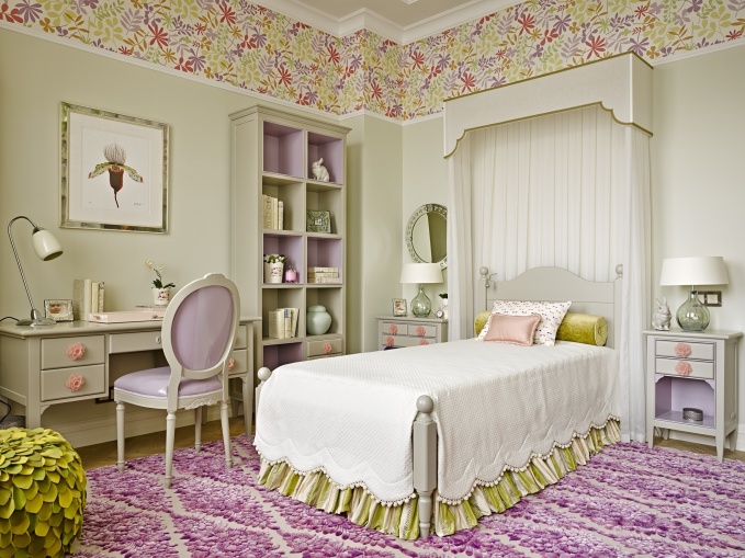 В интерьере детской комнаты мебель для детской Halley. Обои с орнаментом, Jane Churchill. Поставщик мебели, света, текстиля -Charles.Cameron. Автор проекта Ольга Кушнарева-Леоне. Подробнее об объекте здесь.