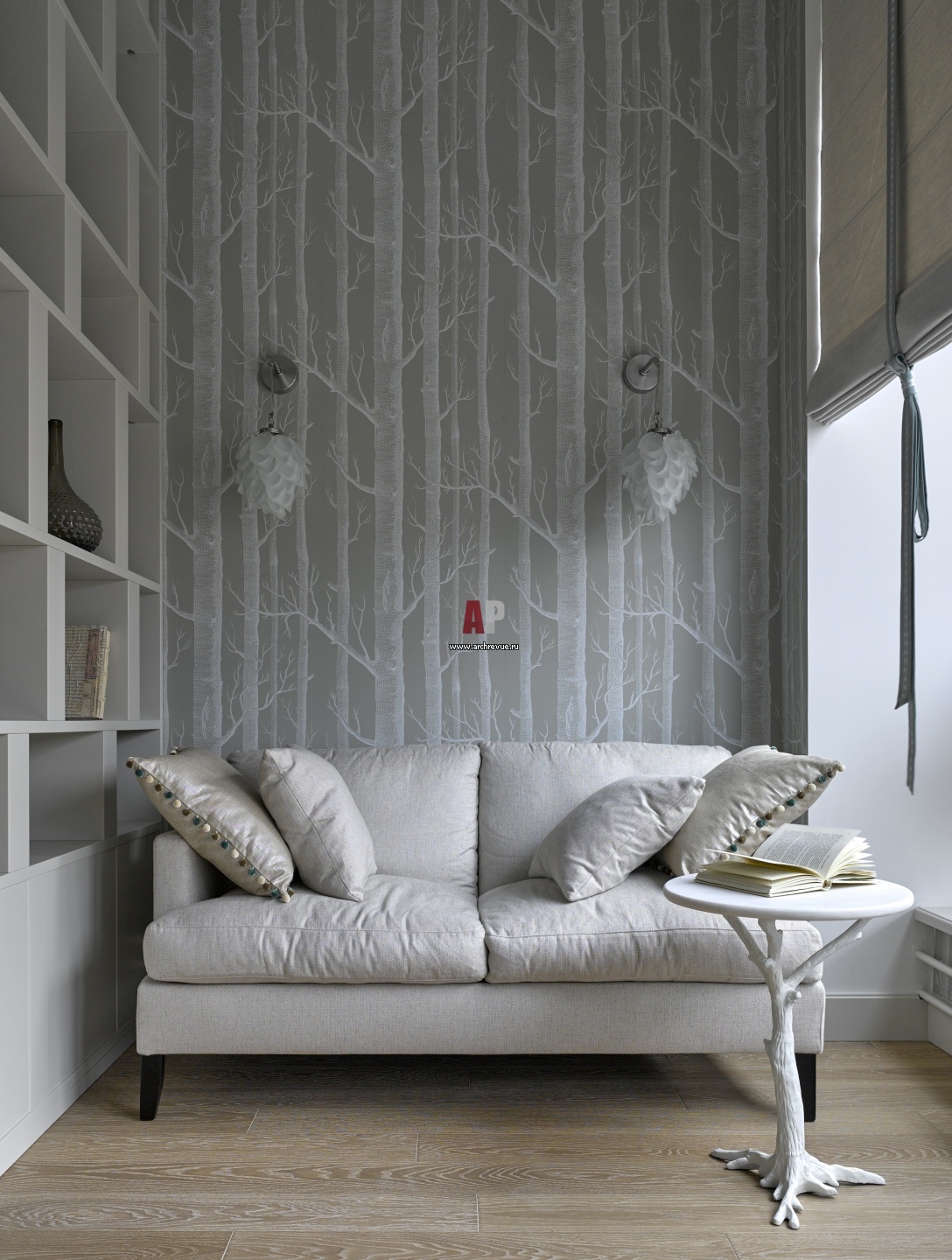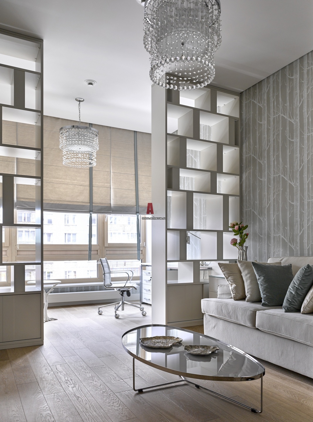 В интерьере детской в серо-серебристых тонах английские обои Cole & Son с рисунком в виде белых деревьев на светлом сером фоне. Люстры, Uttermost. Журнальный столик, Cattelan Italia, поставщик Charles.Cameron. Автор проекта Ольга Кушнарева-Леоне. Подробнее об объекте здесь.