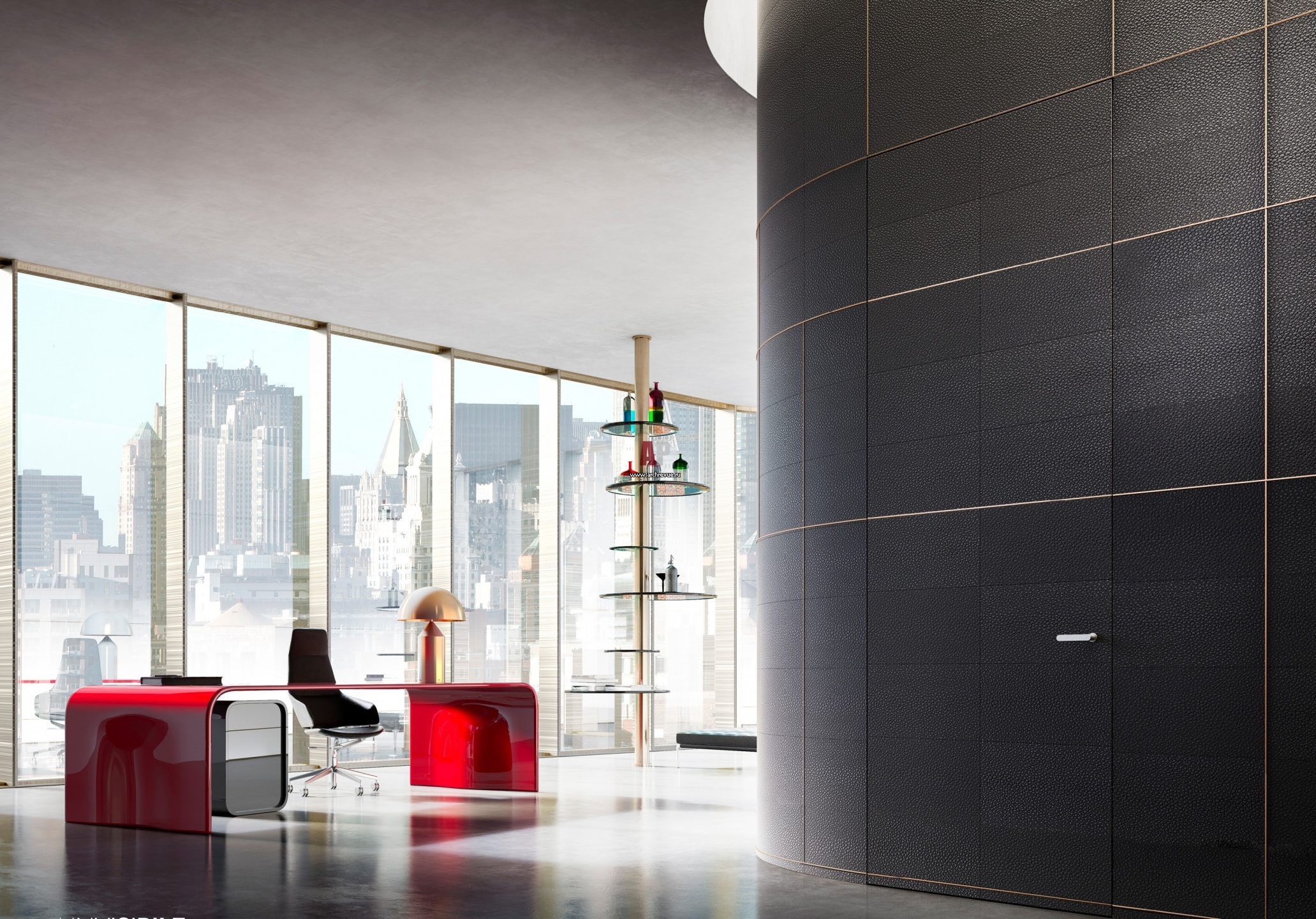 Радиусная дверь невидимка Linvisibile. Покрытие Натуральная кожа относится к числу самых инновационных отделок Linvisibile. Высокая прочность, оригинальные текстуры, престижность материала - всего лишь несколько причин, по которым кожу выбирают в качестве покрытия для двери.