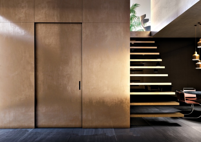 Дверь невидимка Linvisibile. Покрытие Металл с блестящей поверхностью металла. Доступные отделки: «естественная» медь глянцевая или матовая, «естественная» латунь глянцевая или матовая, сатин алюминий. Возможны другие отделки по запросу.