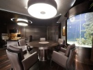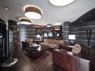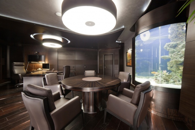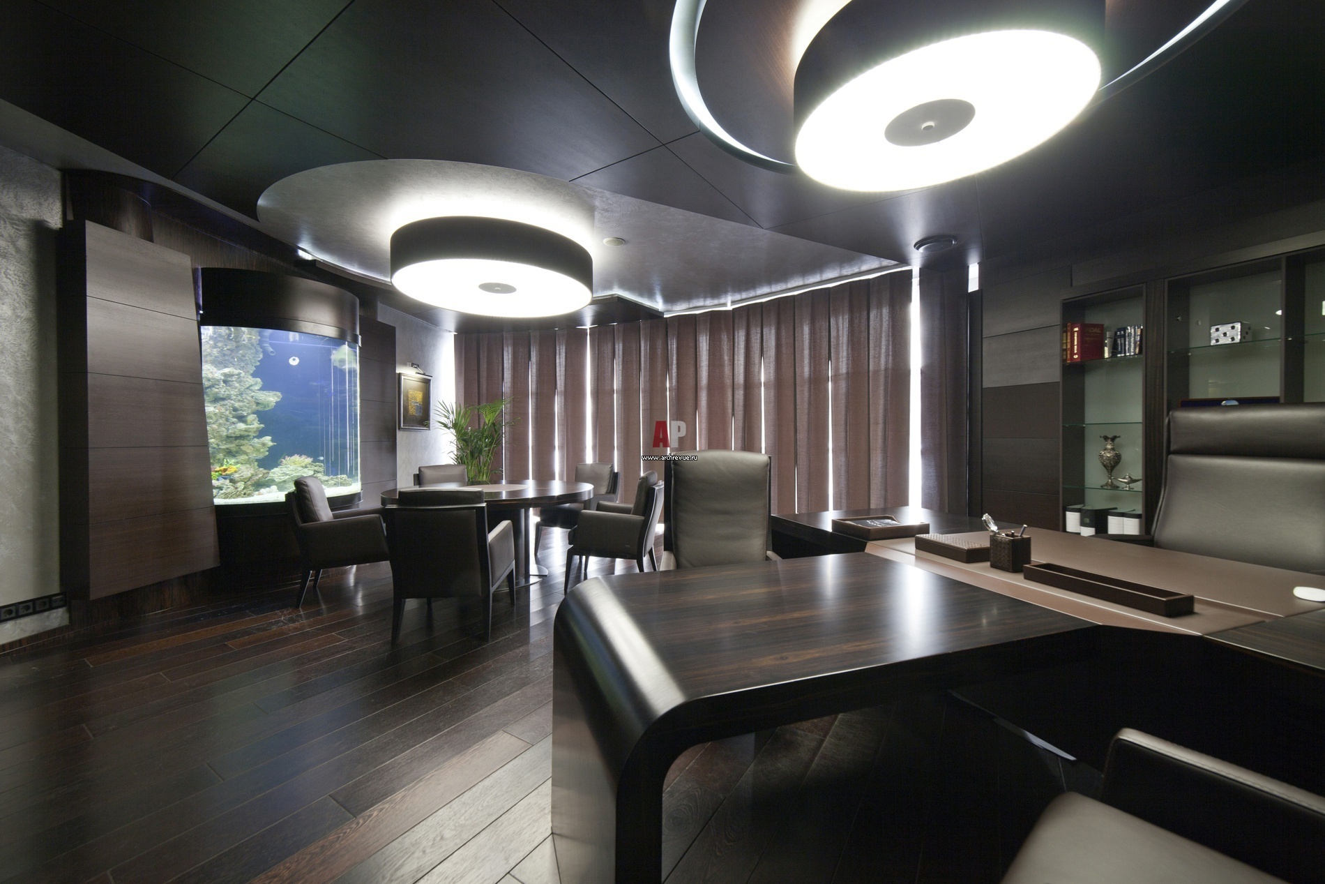 Приемный кабинет имеет другой приоритет – здесь акцент смещается на «приемную зону», где располагаются кресла и журнальный стол. В качестве уместных элементов в интерьер приемного кабинета могут быть интегрированы бар и винный шкаф, шахматная и ТВ-зона.