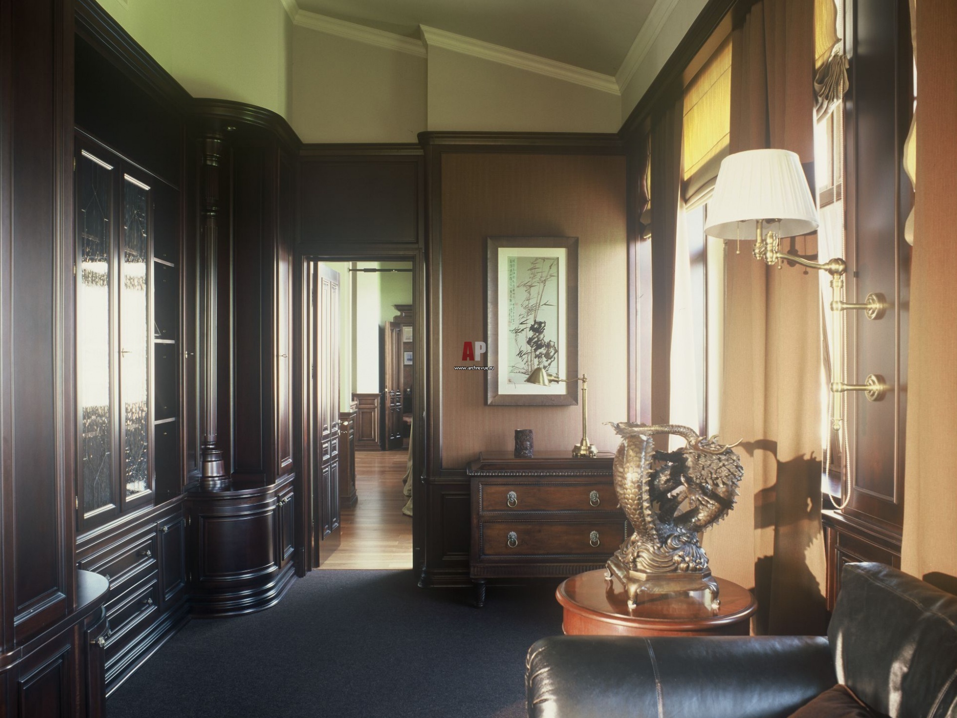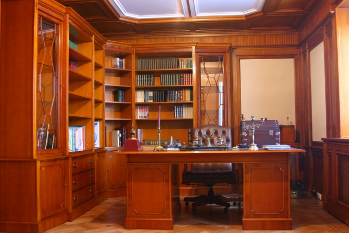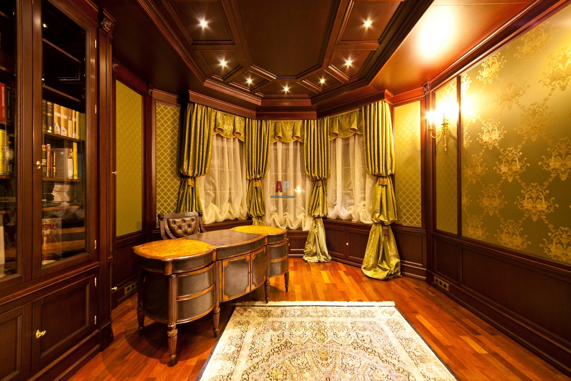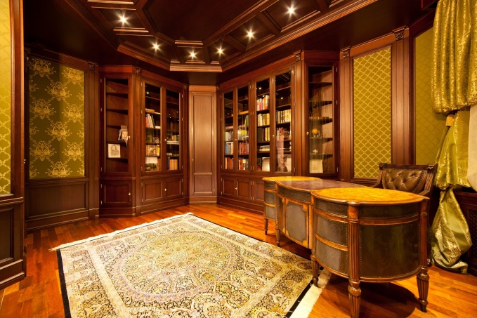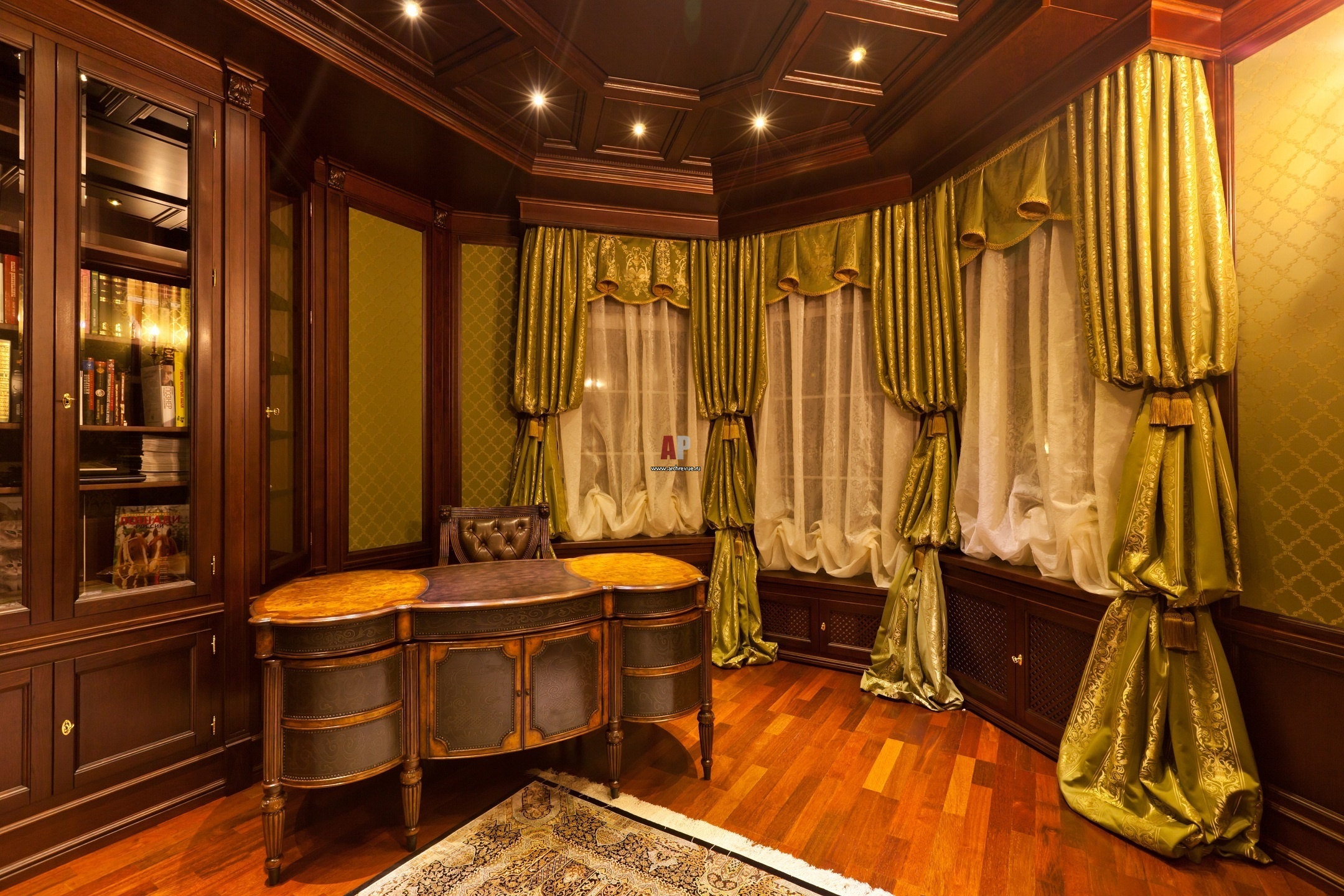 Столярные изделия в интерьере кабинета в загородном доме в классическом стиле.