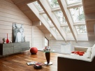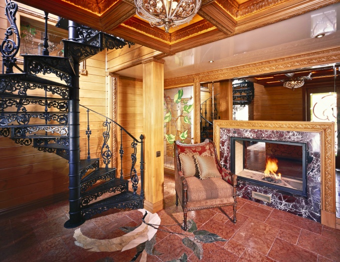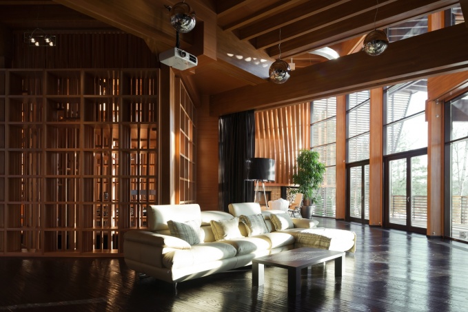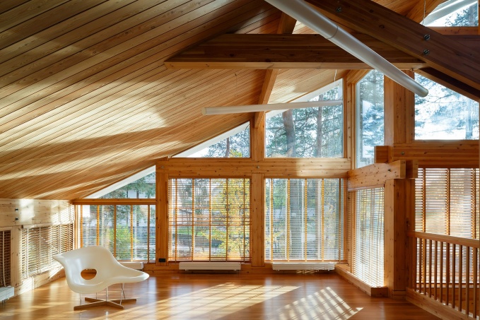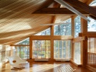 Для введения в интерьер деревянного дома светлых тонов и ровных плоскостей архитекторы применяют натяжные потолки, играют цветом полов.