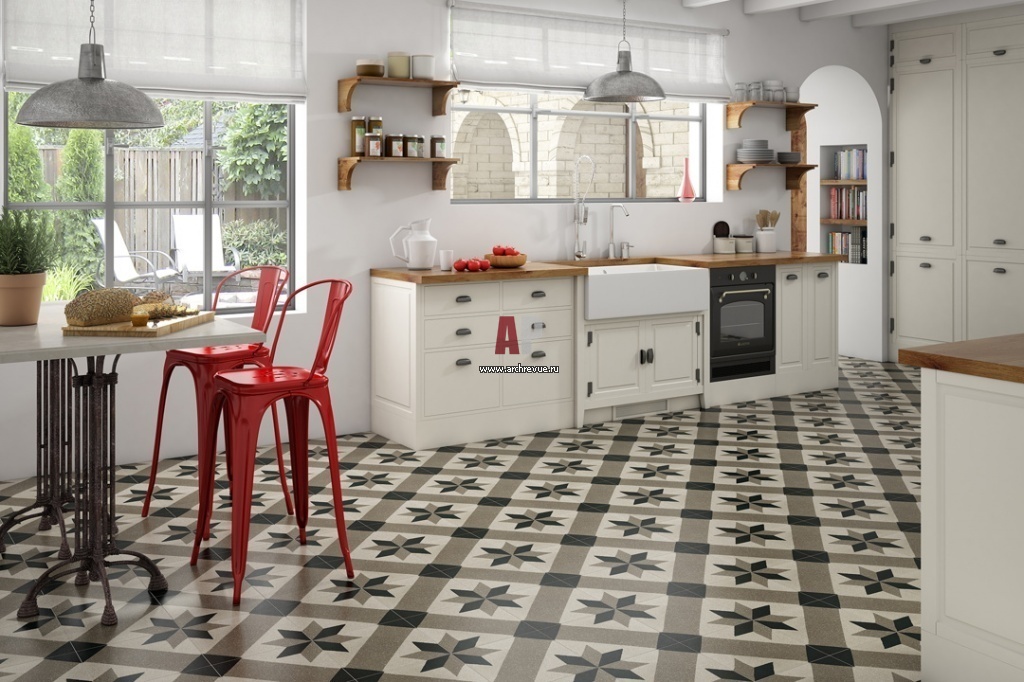 Метлахская плитка на полу кухни. Подробнее здесь.