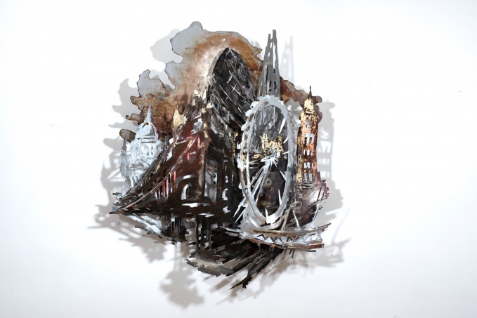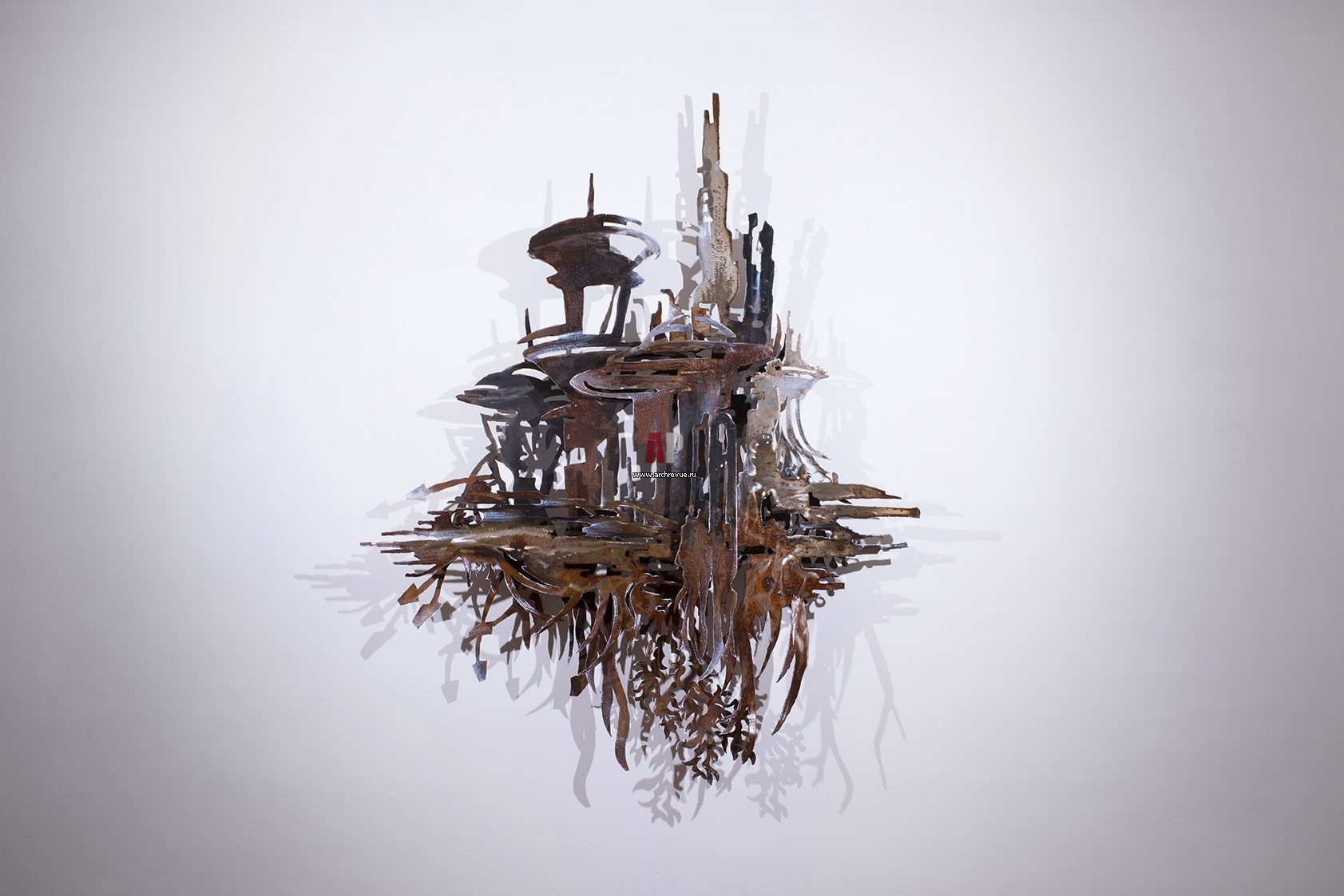 Картина в металле Root city Kitej. Художник-скульптор Фредерик Дати (Frederic Daty). Фредерик Дати создает произведения современного искусства, изучая отношения между людьми и окружающей их средой. В серии настенных скульптур он выстраивает собственные экосистемы, построенные с использованием энергии и веществ. Он снимает с объекта детали и сохраняет только его структуру, скелет (конкретизированный сырой сталью) и энергетические потоки (проиллюстрированные тенями, светом и перспективой). Так он играет с предлагаемой средой, добавляя собственные эмоции. Скульптуры художника выставлены в галереях и арт-ярмарках Европы.
