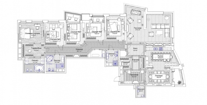 Холлы, open space пространства, спальни, кладовки, гардеробные, постирочно-сушильные помещения – планировочные решения идеологически воплощают уровень «премиум», как и эксклюзивная сантехника, натуральные материалы и конечно дизайн, ценный и актуальный…