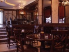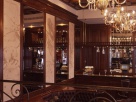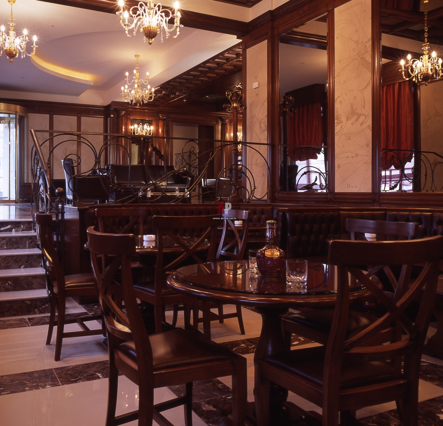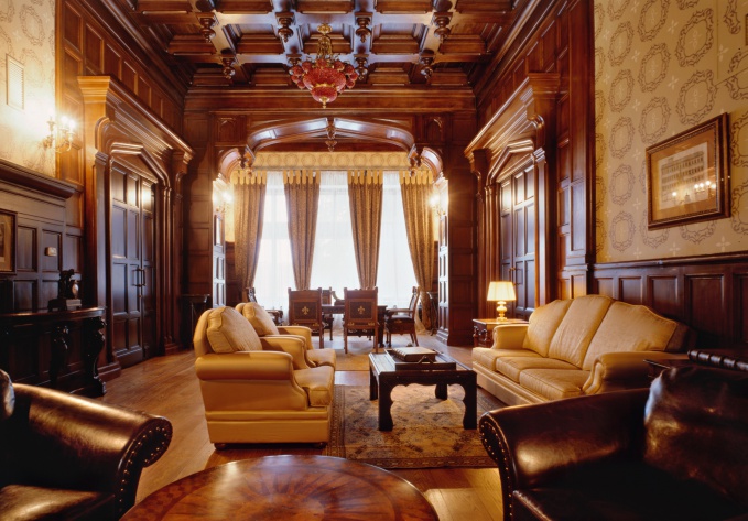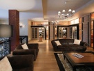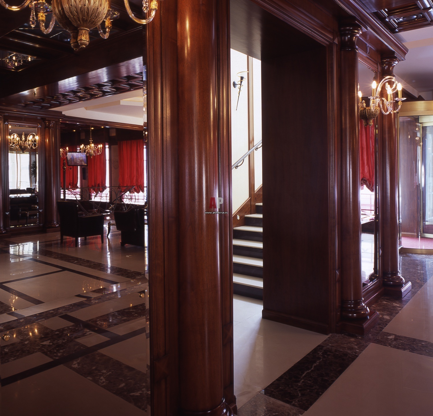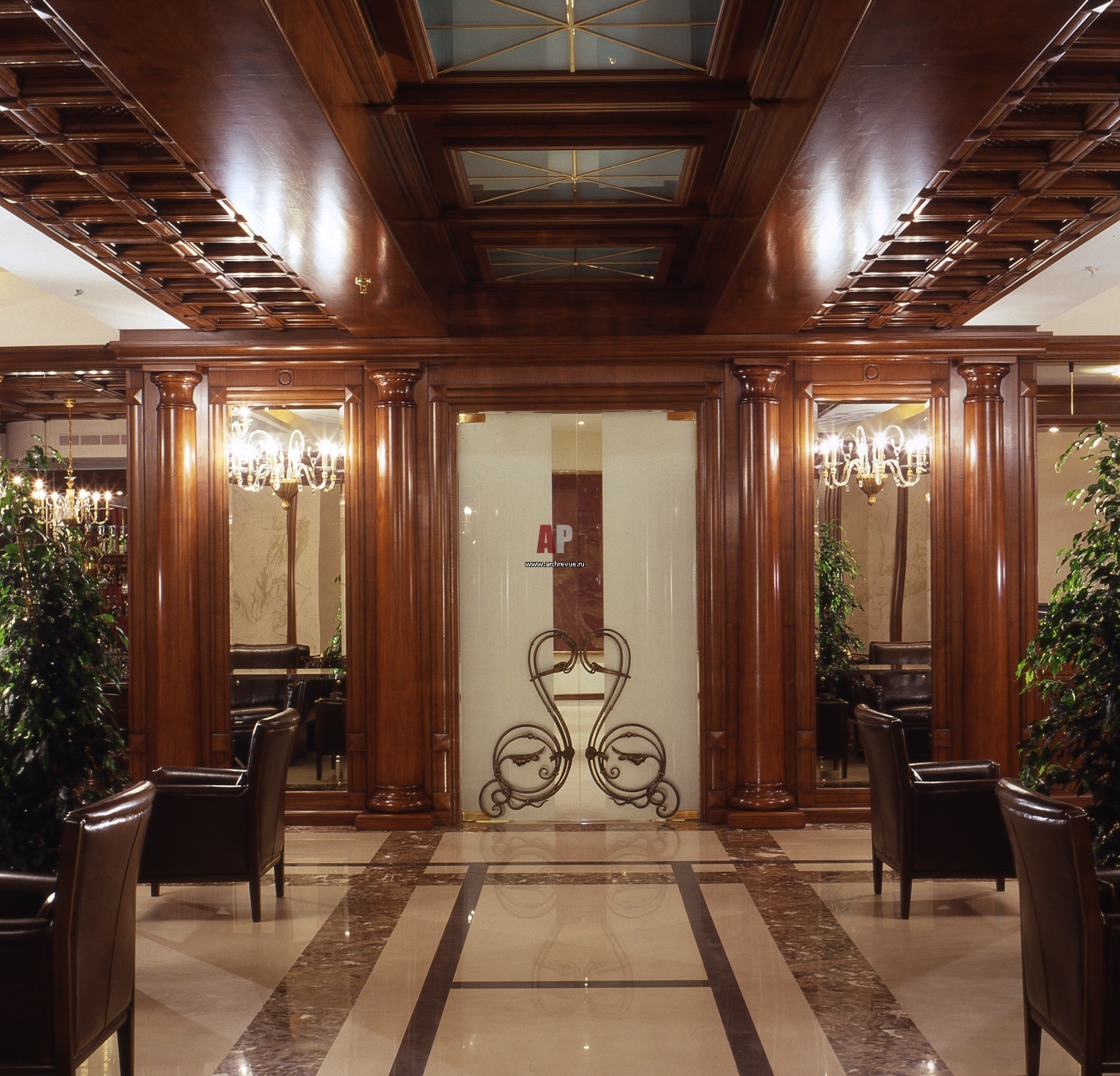 Интерьер зала гостиницы. Все столярные изделия выполнила компания Bamax, победившая в тендере. Благодаря грамотной работе архитекторов, удалось оптимизировать производство: дерево декорировали вставками из обоев и ткани. Так при сохранении эстетики снизилась себестоимость столярных работ.