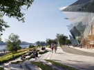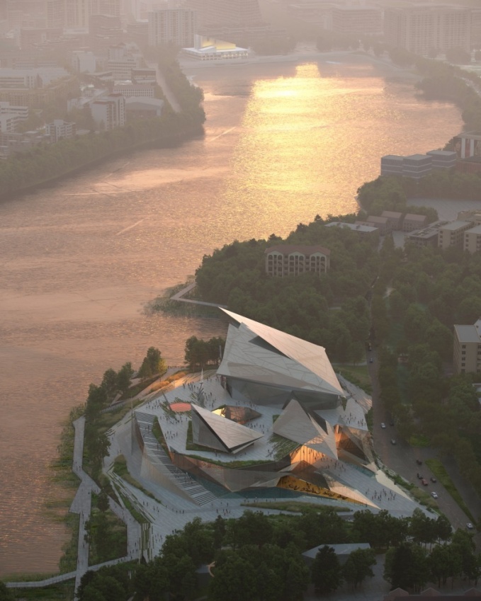 Проект победитель. Консорциум под лидерством ООО «Ваухаус» (Москва, Россия). Новое здание задумано как часть топографии места, как парк с пешеходными маршрутами и рекреационными зонами, интегрированными и продолжающими существующее благоустройство набережных.