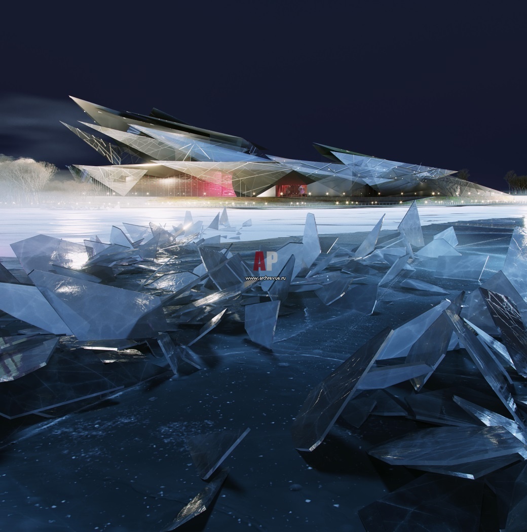 Проект победитель. Консорциум под лидерством ООО «Ваухаус» (Москва, Россия). Геометрия нового театра навеяна редким природным явлением: «ледяными цветами» на озере Кабан. Зимой объем сольется с окружающей средой и станет частью облика озера. Летом единение с природой места будет обеспечено за счет многогранного отражения прозрачных фасадов в водной глади. «Заостренность», устремленность — характерные черты Татарской культуры, архитектуры и искусства.