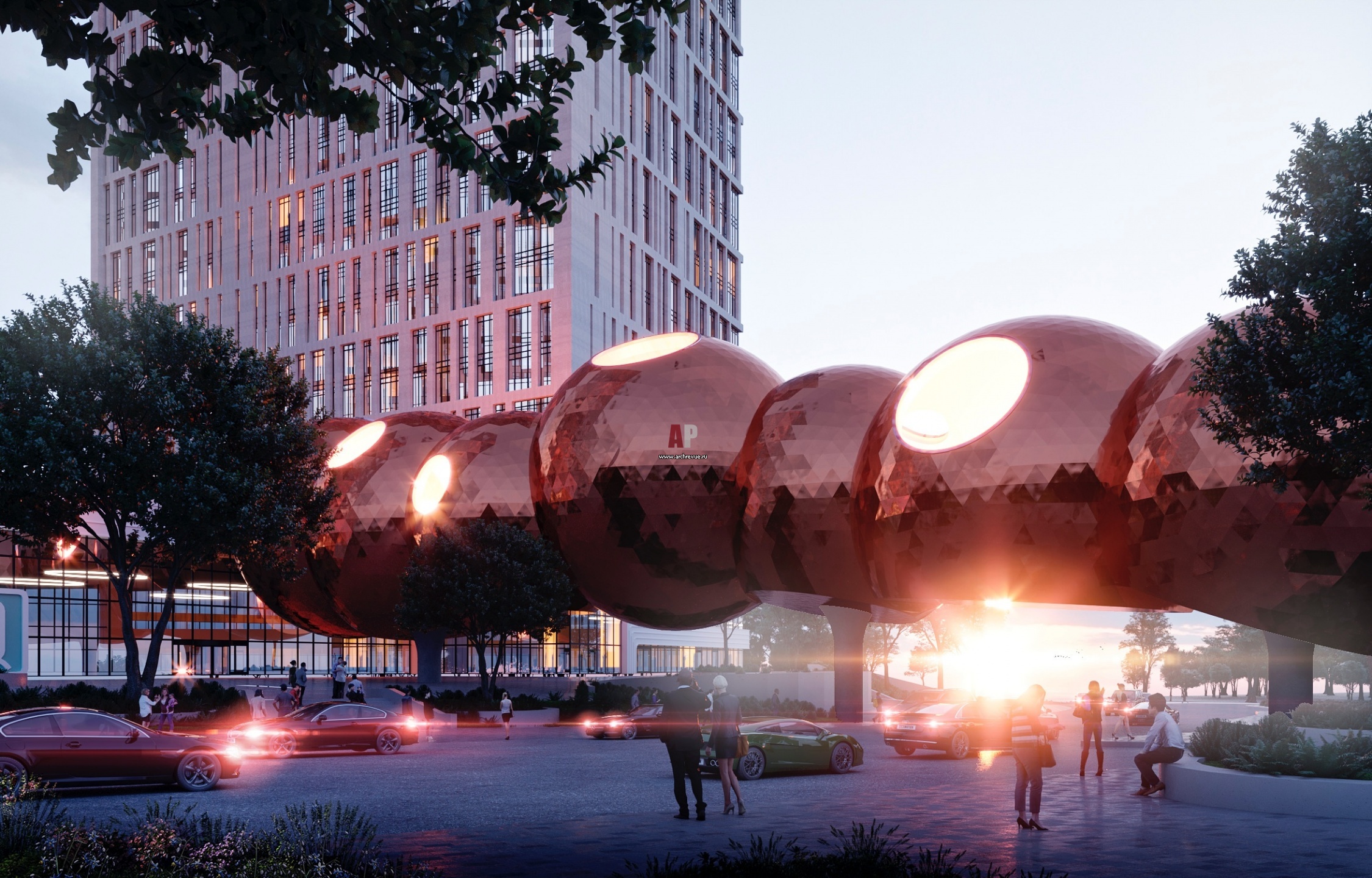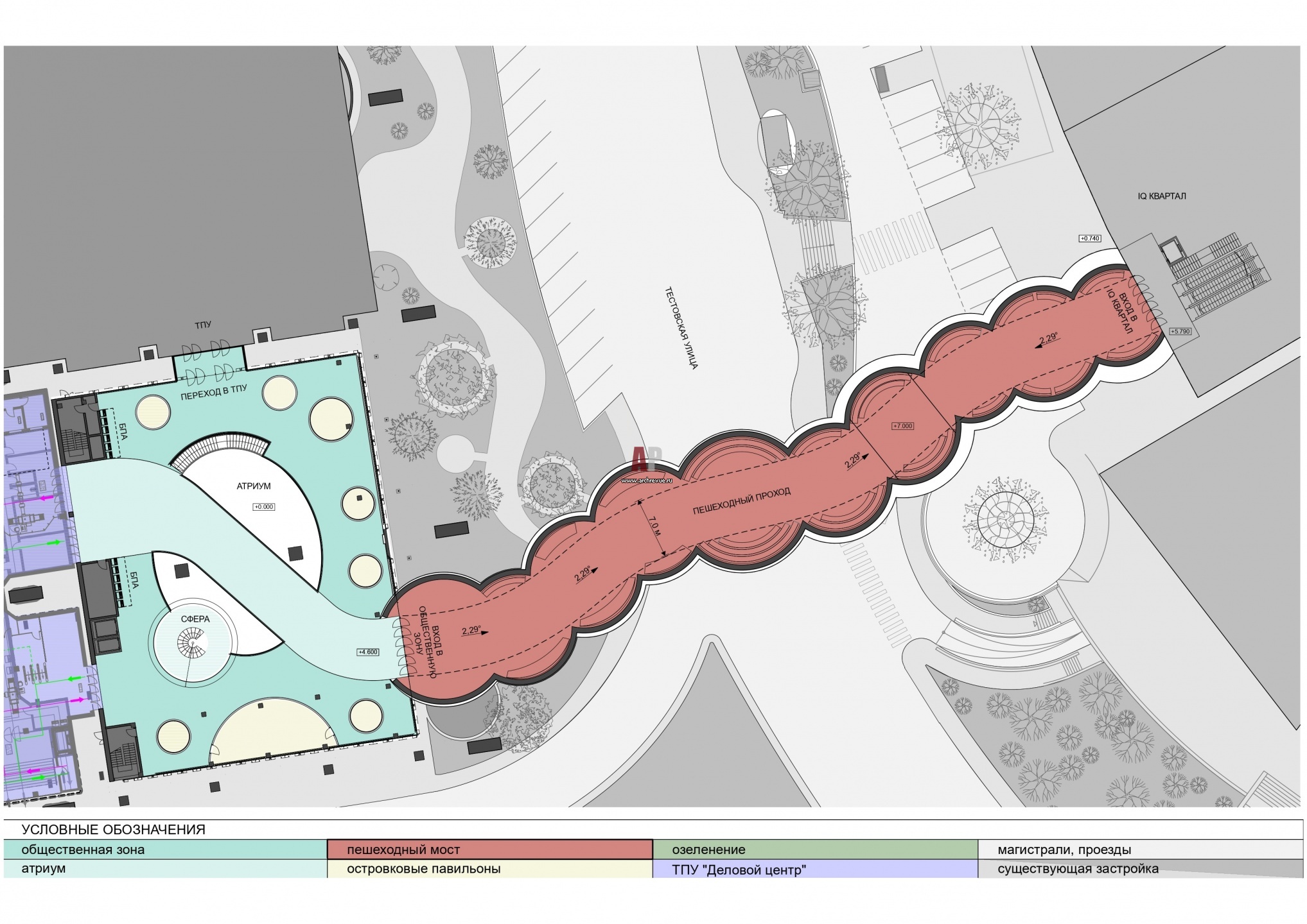 Мост соединит общественную зону транспортно-пересадочного узла и МФК «IQ-квартал». Проект разработан главным архитектором Москвы Сергеем Кузнецовым и архитектором Дмитрием Суховым. Протяженность моста составит 95 метров, а диаметр сфер будет варьироваться от 13 до 16 метров. Вдоль него высадят крупномерные деревья, их шарообразные кроны станут важной композиционной составляющей. Отражаясь на поверхности сфер, они создадут эффект зеленых фасадов в плотной структуре делового центра.