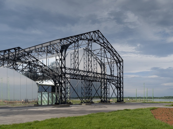 Вновь возводимые конструкции не выходят за пределы исторического каркаса и отступают от него внутрь на 1800 мм по периметру в плане. Кровля большого павильона имеет отступ более 500 мм от исторического каркаса, кровля малого объема более 200 мм. В качестве основного материала наружной облицовки применены фасадные панели из нержавеющей стали толщиной 40мм. По горизонтали и вертикали фасады разбиты технологическими швами. Там, где внутри необходимо естественное освещение, на фасадах размещены панорамные окна в пол – перед ними установлены ламели из перфорированной нержавеющей стали.