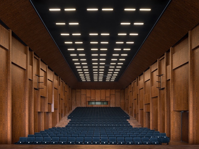 Если же говорить о новом назначении пакгаузов, то в литере И размещается павильон с культурно-выставочной функцией, а в литере Ж (более крупный по площади и расположенный ближе к воде объем) – павильон с конференц-залом на 608 мест с 3 надземными уровнями. В литере И мы из вестибюля попадаем в глухие пространства выставочных залов без естественного освещения, отделанные белой матовой штукатуркой. В литере Ж через многосветный вестибюль проходим в конференц-зал с акустической отделкой из рельефных деревянных панелей, что создает контраст между светлым пространством вестибюля и камерной, уютной атмосферой зала.