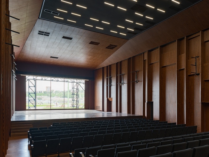 В меньшем объеме каждого из них разместились необходимые сопутствующие функции – инженерные и служебные помещения, вестибюль с кассовой зоной, гардероб, буфет, санузлы. Основными материалами отделки внутренних стен общественных пространств являются металлические кассеты. Пол наливной – терраццо, белого цвета с фракциями разных оттенков.