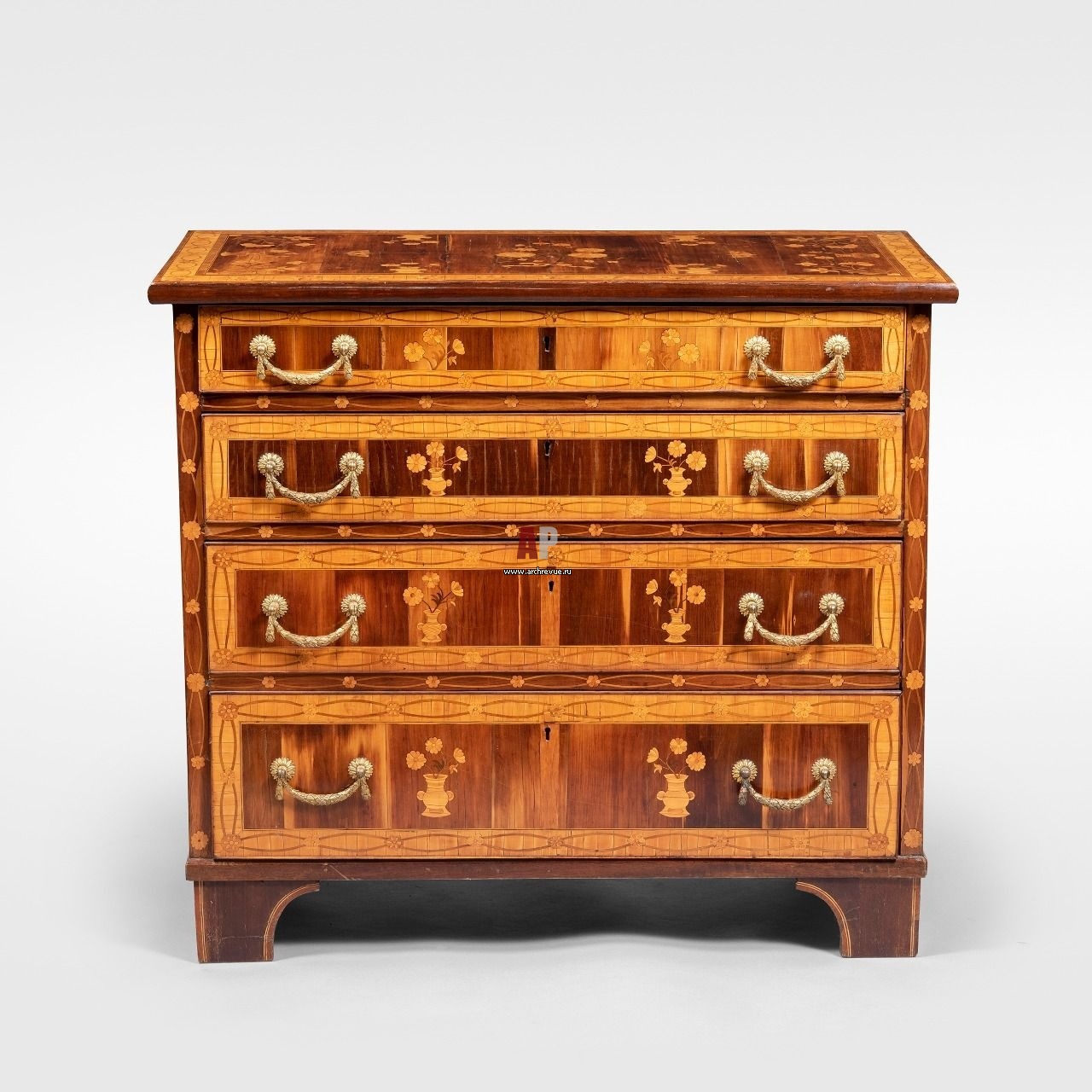 Наборный комод с бронзовыми накладками конца XVIII века.